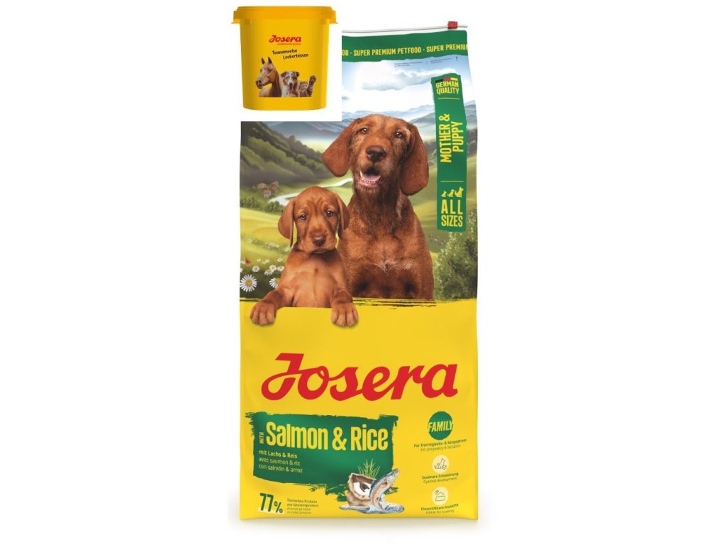 Josera Mother & Puppy Salmon & Rice je lahodné krmivo pro březí nebo kojící feny a jejich štěňata. Speciální bezlepková receptura tohoto krmiva pro štěňata poskytuje štěňatům všechny nezbytné živiny, které potřebují, a to jak v děloze, tak i během laktace. Toto energeticky bohaté krmivo pro psy také splňuje specifické nutriční potřeby feny od poslední třetiny březosti až do konce laktace.