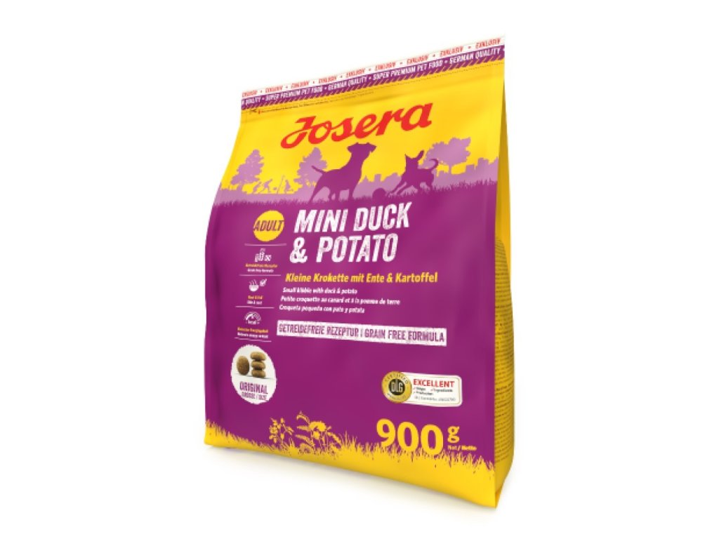 Složení: sušené kachní bílkoviny 26%, sušené brambory 26%, sušená tapioka, oleje a tuky, řepná vláknina, bramborové bílkoviny, sušený svatojánský chléb, hydrolyzované drůbeží bílkoviny, kvasnice, hydrolyzované rostlinné bílkoviny, minerální látky, mletý kořen čekanky (přírodní zdroj inulinu)