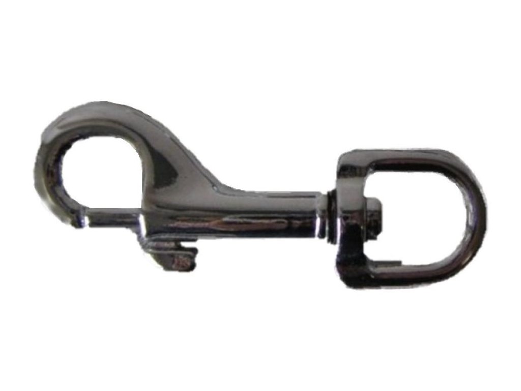 Klasická háková karabina s otočně uloženým půlkulatým okem pro připevnění k vodítku.Rozměr: 7,5cm