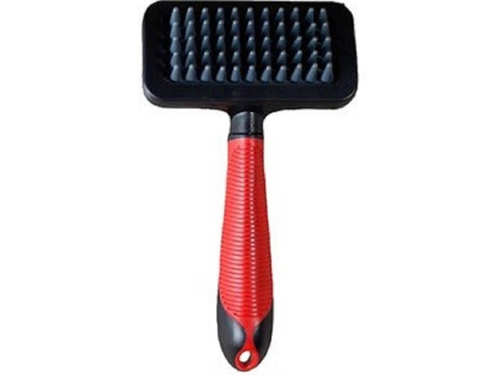 Masážní kartáč s gumovými výstupky pro každodenní péči o srst, opatřený gumovou protiskluzovou rukojetí.