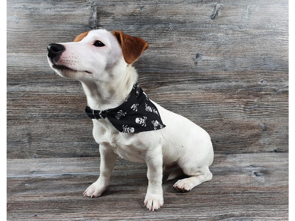 Hladký kožený obojek je vyroben z kvalitní kůže, pro pevnost je obšitý nití do barvy. Je vybaven svařovanými déčky, tak dosahuje maximální pevnosti. Jeho ozdobou je bavlněný šátek v různém designu.