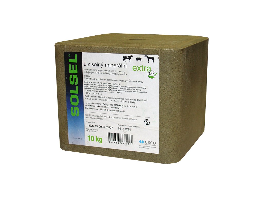Slouží k doplnění minerálních látek dle individuálních potřeb. Solný minerální liz Solsel Extra pro koně a dobytek 10 kg - schváleno pro využití v ekologickém zemědělství.