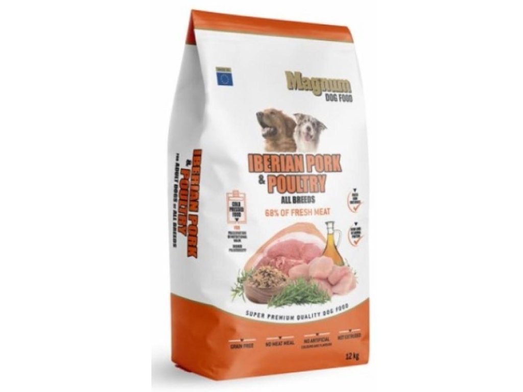 Krmivo Magnum Iberian Pork & Poultry for All Breeds je vyrobeno bez masových mouček pouze z čerstvého Iberského vepřového masa a drůbežího masa z volného chovu, bez lepku a bez přidaných tuků. Důležitým faktorem je, že krmivo není extrudováno.