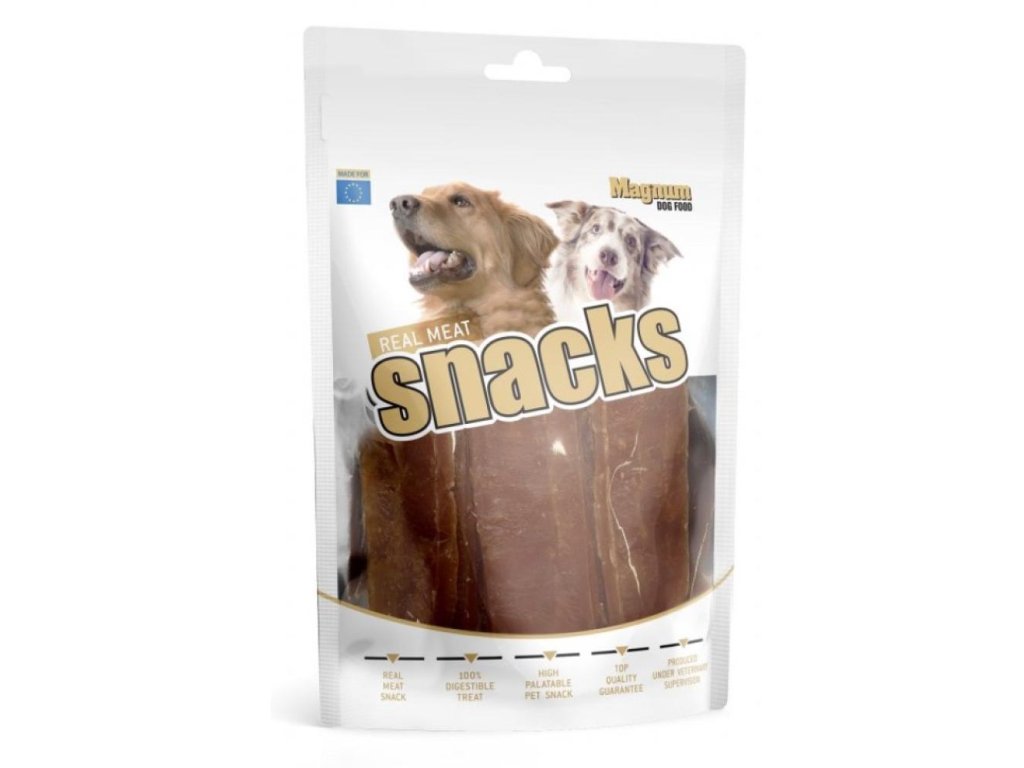 100% přírodní výtečné králičí maso v podobě chutných filet. Jemně mleté králičí maso a vedlejší produkty rostlinného původu jsou základem pro tento pamlsek. Široký, ale tenký plátek bez výrazné struktury, je měkký a ohebný, snadno se trhá na malé kousky. Slouží jako odměna při hře, výcviku nebo jako doplněk stravy při cestách. Nezatěžují organismus, jsou výborně stravitelné. Bez negativních účinků na zuby a dásně.