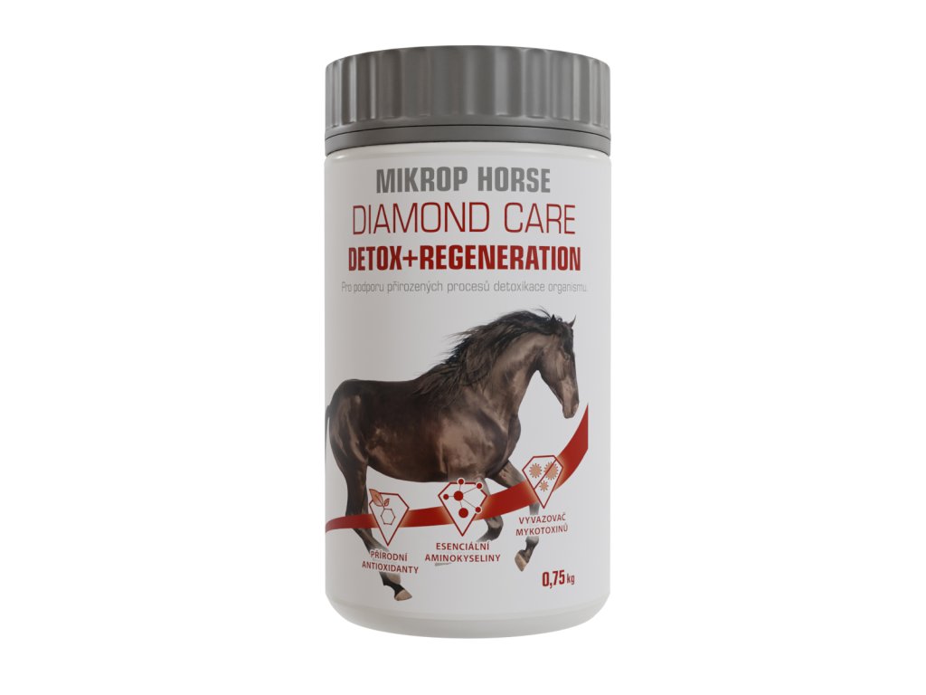 MIKROP® HORSE DIAMOND CARE DETOX+REGENERATION je doplňkové krmivo pro koně s obsahem vyvazovače mykotoxinů Mycosorb A+ a výlisků semene ostropestřce mariánského. Obsahuje vitamin C, vitamin E, vitaminy skupiny B a esenciální aminokyselinu lysin.