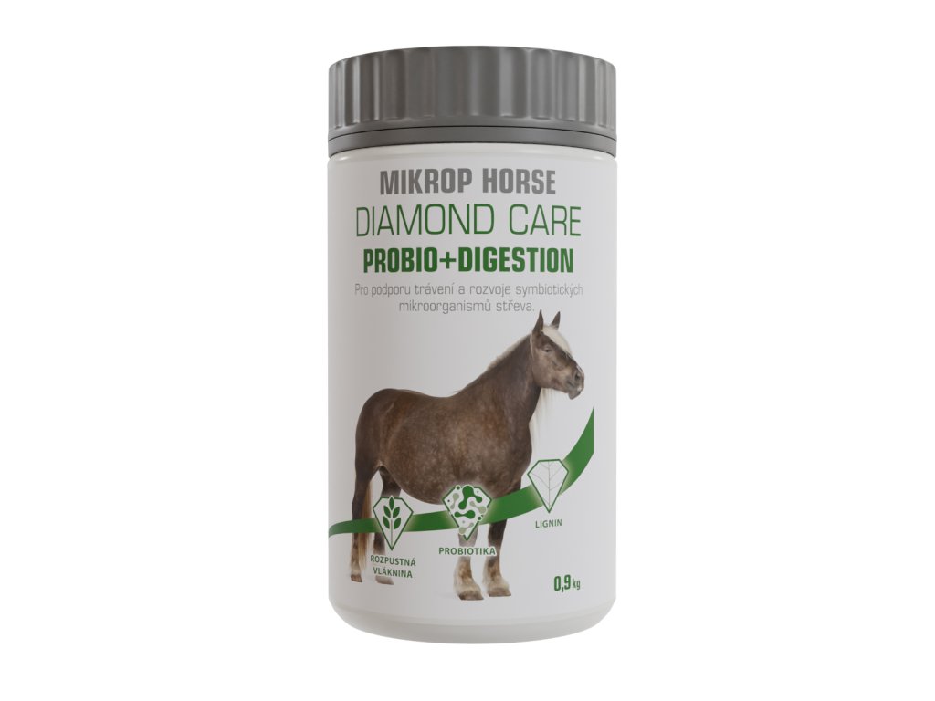 MIKROP® HORSE DIAMOND CARE PROBIO+DIGESTION je doplňkové krmivo pro koně s obsahem živých mikroorganismů druhu Saccharomyces cerevisiae, prebiotické vlákniny, vitaminu E, K a vitaminů skupiny B.