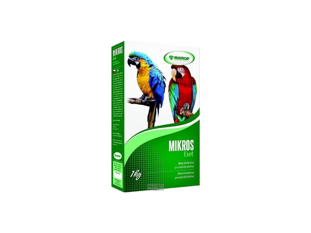 Svým obsahem minerálních látek, vimínů a aminokyselin vhodně doplňuje celkovou denní potřebu těchto živin u ptactva. Příznivě působí na oplozenost a líhnivost vajec a zlepšuje životaschopnost a správný vývoj mláďat. Grit svojí hrubou strukturou napomáhá rozmělňování potravy ve voleti a tím zvyšuje příjem krmiva. Podporuje dobrý zdravotní stav papoušků a jiných exotických ptáků. MIKROS exot obsahuje bylinný extrakt Biostrong, zlepšující činnost dýchacího aparátu. Přidává se do krmiva důkladným zamícháním.