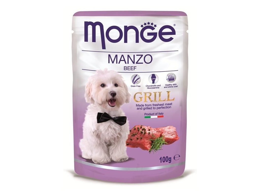 Superprémiová kapsička pro psy z čerstvého masa na grilu, která potěší chuťové buňky Vašeho psa, s glukosaminem a chondroitinem pro zdravé klouby. S kapsičkami Monge Grill bude mít Váš pes zdravou a lesklou srst. Bez obilovin.