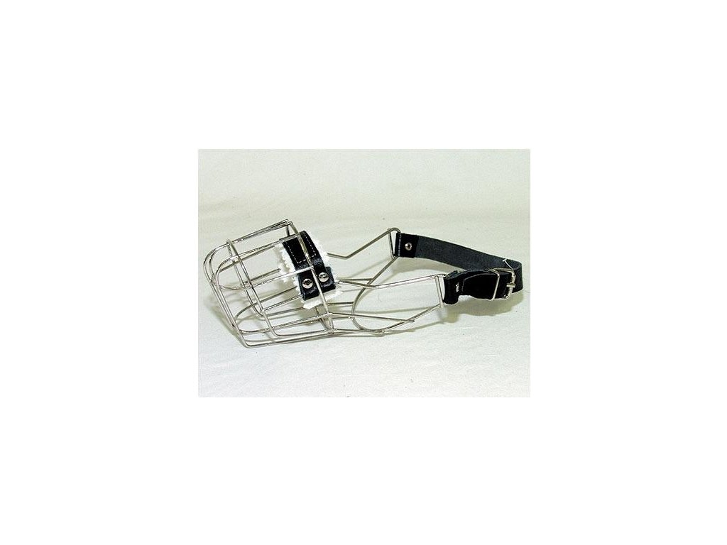 Kovový náhubek s koženými řemínky na zapínání pro fenu malého knírače