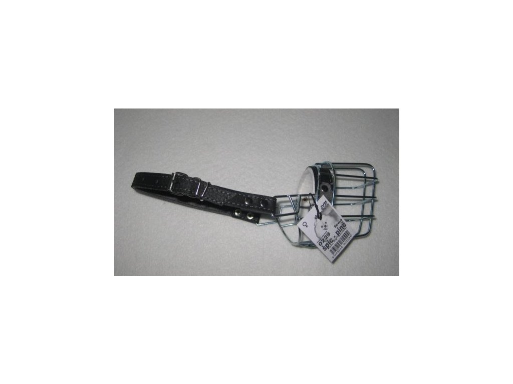 Kovový náhubek s koženými řemínky na zapínání pro fenu malého knírače