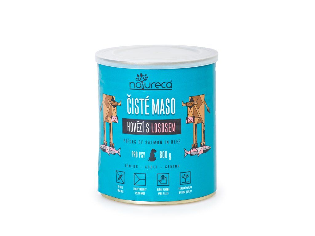 Hovězí s lososem je konzerva obsahující 30 % kusů lososa ručně vložených do 70 % na hrubo namletýho hovězího masa.