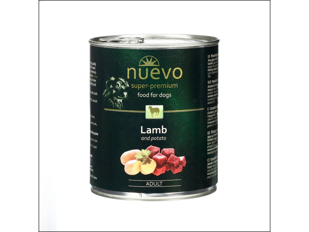 Konzerva Nuevo Jehněčí s bramborem je vhodná pro dospělé psy všech plemen, s obsahem jehněčího masa s bramborem. Výběrové, jehněčí maso je vysoce obohaceno o potřebný zdroj bílkovin, naopak brambory skvěle podporují správné trávení.