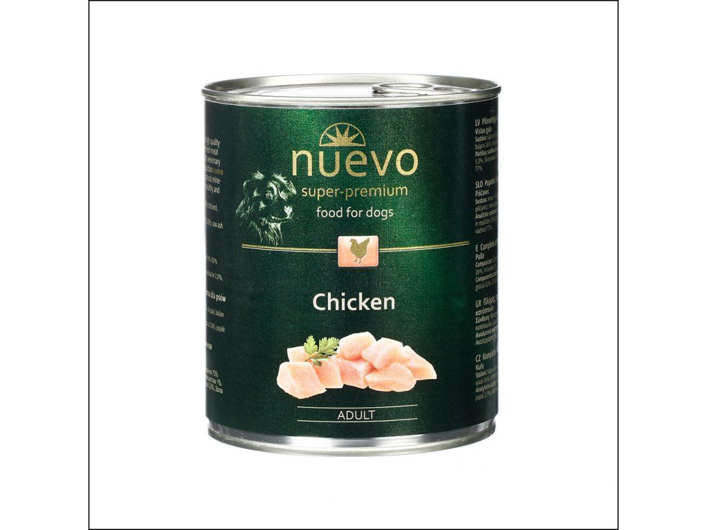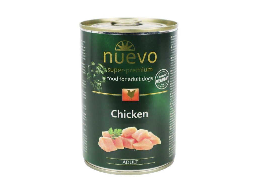 Nuevo konzerva pro dospělé psy všech plemen. Nuevo adult konzervy s kuřecím masem je výborně stravitelné, tato kvalitní strava může napomoci k zlepšení stavu kožichu psa. Kuřecí maso s vysokým obsahem bílkovin a s potřebnými minerály vytváří ideální nutriční základ pro vašeho psa. Tento vynikající zdroj živočišných bílkovin odpovídá masožravým vlastnostem psa.