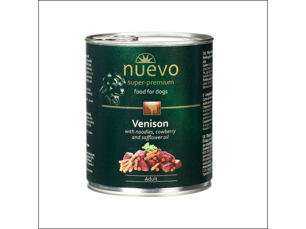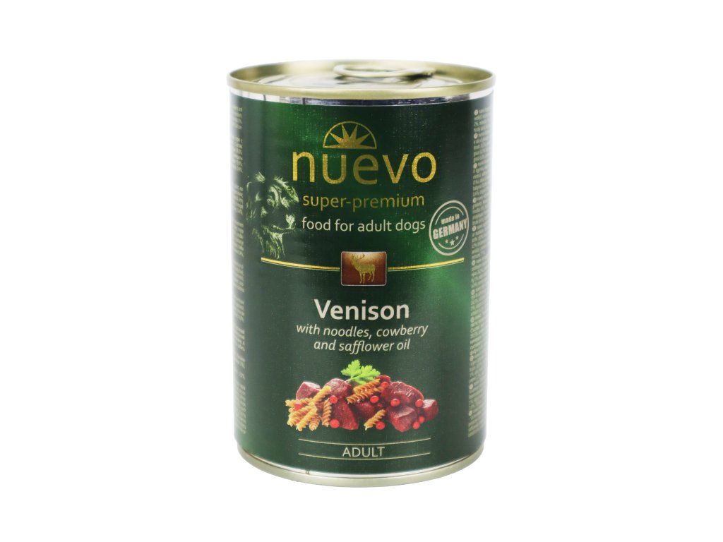 Konzerva Nuevo pes adult Zvěřinové menu je speciální krmivem pro dospělé psy. Zvěřina zajišťuje veškeré potřebné výživné látky pro vašeho psa. Vysoký obsah masa společně s nudlemi a vynikajícím světlicovým olejem jsou tím nejlepším z této receptury. Světlicový olej podporuje zdravý kožich díky dokonalé kombinaci esenciálních mastných kyselin a podněcuje dobré trávení.