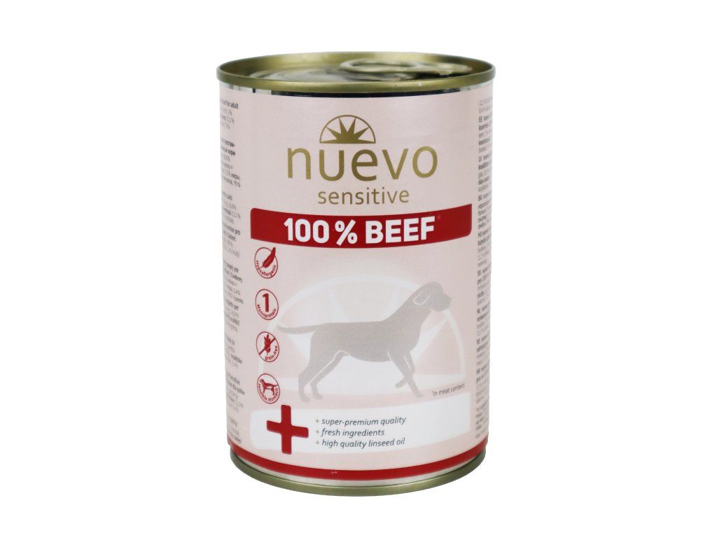 Konzerva pro psy Nuevo Sensitive je kompletním superprémiovým krmivem pro dospělé psy s citlivým zažíváním. Obsahuje 72% hovězího masa a 26,8% masového vývaru. Monoproteinová receptura krmiv značí obsah pouze jednoho zdroje proteinů, tedy masa.