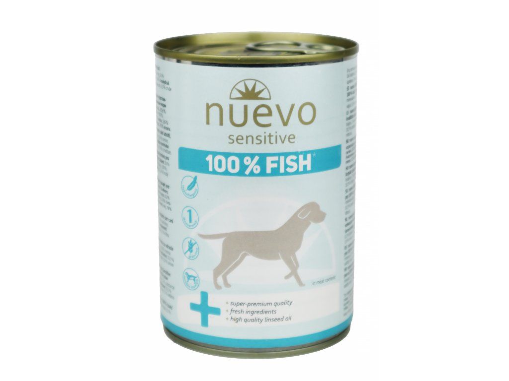 Konzerva pro psy Nuevo Sensitive je kompletním superprémiovým krmivem pro dospělé psy s citlivým zažíváním. Obsahuje 72% rybího masa a 26,8% masového vývaru. Monoproteinová receptura krmiv značí obsah pouze jednoho zdroje proteinů, tedy masa.