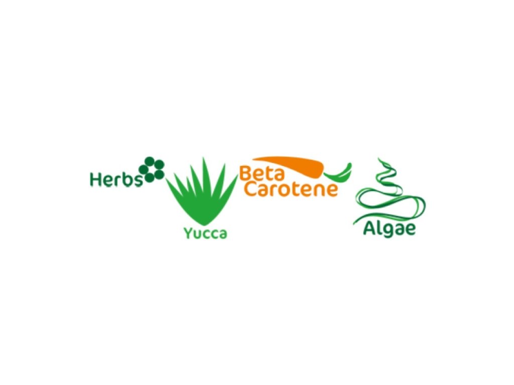 Složení: vedlejší výrobky rostlinného původu (byliny 23%, Yucca schidigera 0,2%), obiloviny, minerální látky, řasy (chaluha 1%, spirulina 0,5%)