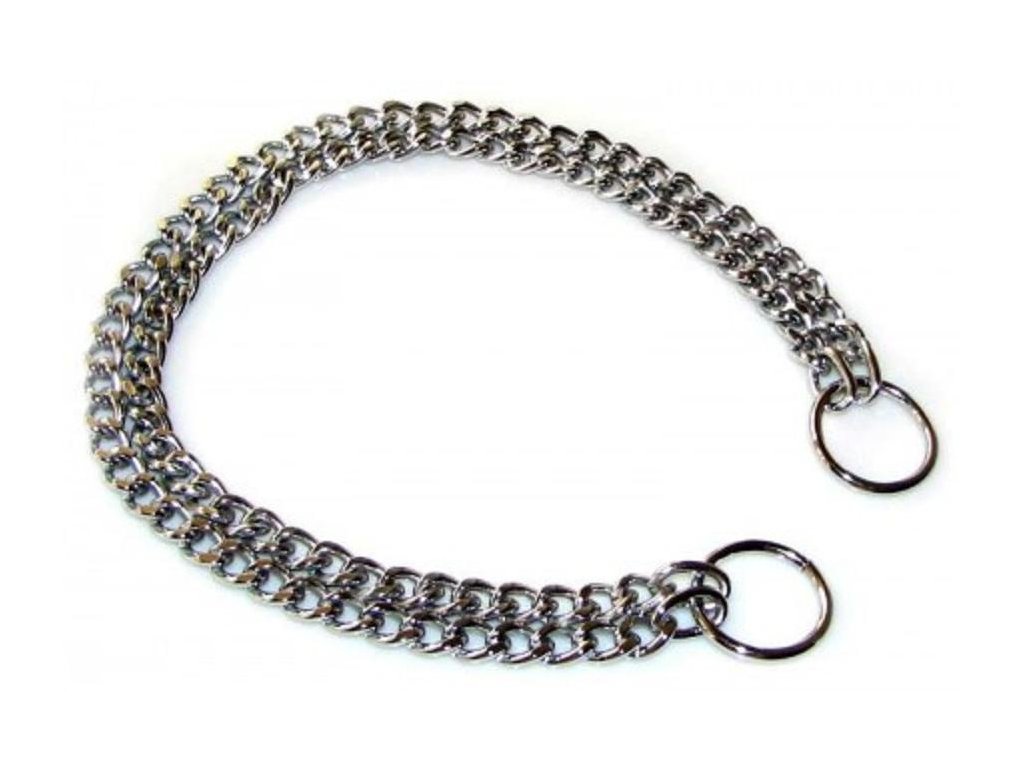 Kovový stahovací dvouřadý obojek. Jedná se o typ obojku, který se utáhne, když za něj pes zatáhne. Pejsek pak reaguje na zvýšený tlak na krku a na zvuk řetízku.