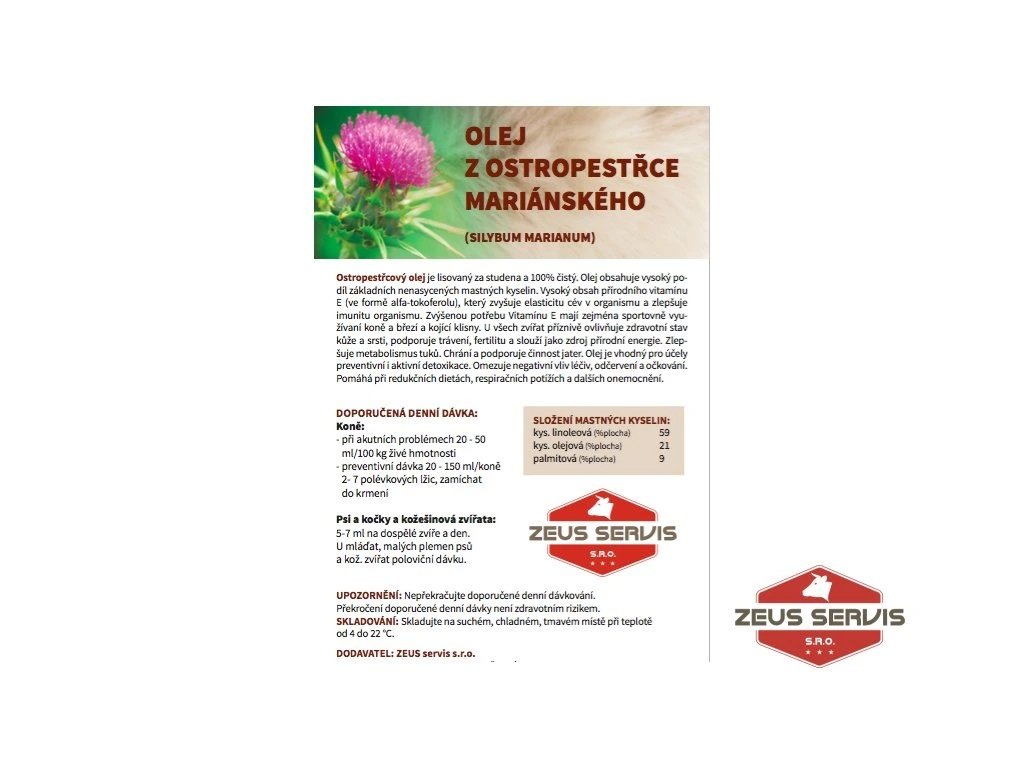 Ostropestřcový olej je lisovaný za studena a 100% čistý. Olej obsahuje vysoký podíl základních nenasycených mastných kyselin. Vysoký obsah přírodního vitamínu E (ve formě alfa-tokoferolu), který zvyšuje elasticitu cév v organismu a zlepšuje imunitu organismu. Zvýšenou potřebu Vitamínu E mají zejména sportovně využívaní koně a březí a kojící klisny. U všech zvířat příznivě ovlivňuje zdravotní stav kůže a srsti, podporuje trávení, fertilitu a slouží jako zdroj přírodní energie. Zlepšuje metabolismus tuků. Chrání a podporuje činnost jater. Olej je vhodný pro účely preventivní i aktivní detoxikace. Omezuje negativní vliv léčiv, odčervení a očkování. Pomáhá při redukčních dietách, respiračních potížích a dalších onemocnění.