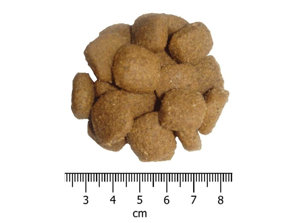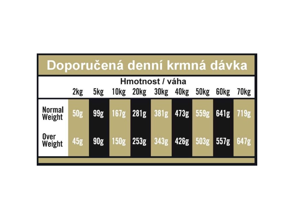 Hrubý protein 27,00 %, hrubé tuky 14,00 %, omega-3 mastné kyseliny 0,80 %, omega-6 mastné kyseliny 2,75 %, EPA + DHA 2 500 mg/kg, hrubá vláknina 4,00 %, hrubý popel 8,00 %, vápník 1,40 %, fosfor 1,00 %. Metabolizovatelná energie 3 643 kcal/kg.