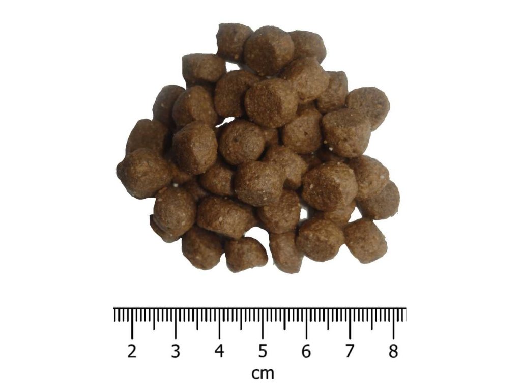 Analytické složky: Hrubý protein 30 %, hrubý olej a tuky 19 %, EPA+DHA 530 mg / kg, hrubá vláknina 1,85 %, hrubý popel 8 %, vápník 1,35 %, fosfor 1,15 %.