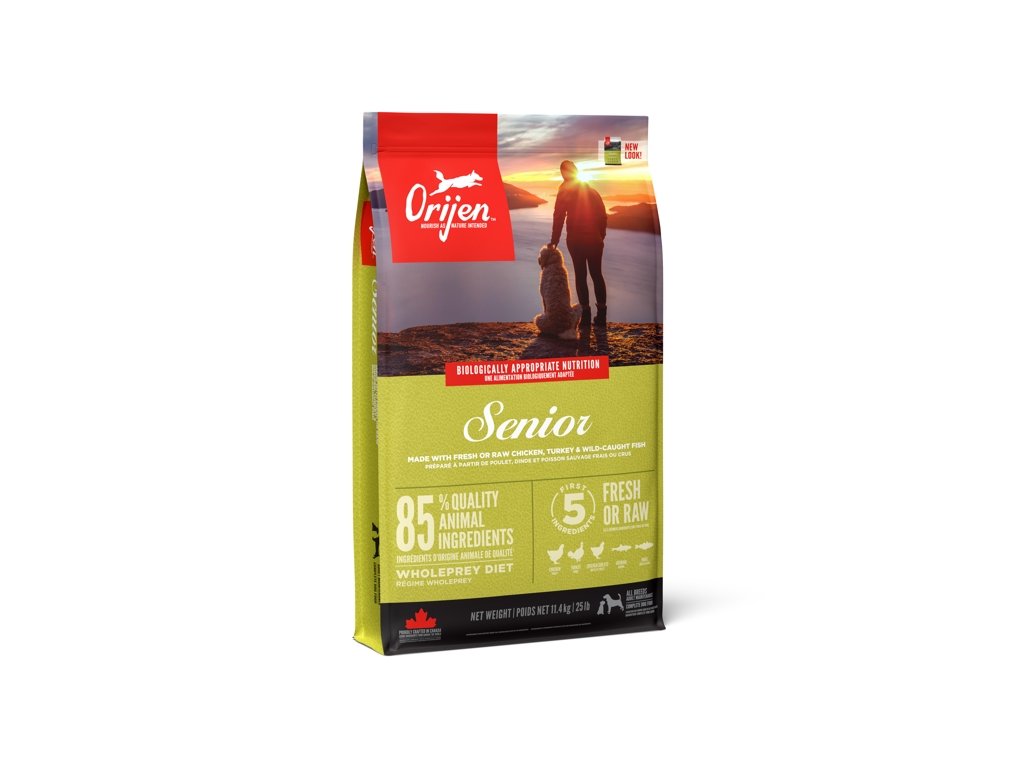 ORIJEN SENIOR obsahuje bezkonkurenční poměr volně chovaných kuřat a krůt, ryb lovených v přírodních vodách a vajec z hnízdních chovů. Všechny suroviny jsou nám dodávány čerstvé nebo syrové. Se sníženým obsahem sacharidů a nízkou glykemickou zátěží je krmivo ORIJEN SENIOR jedinečnou volbou pro zajištění vrcholové kondice všech starších psů, včetně toho vašeho.
