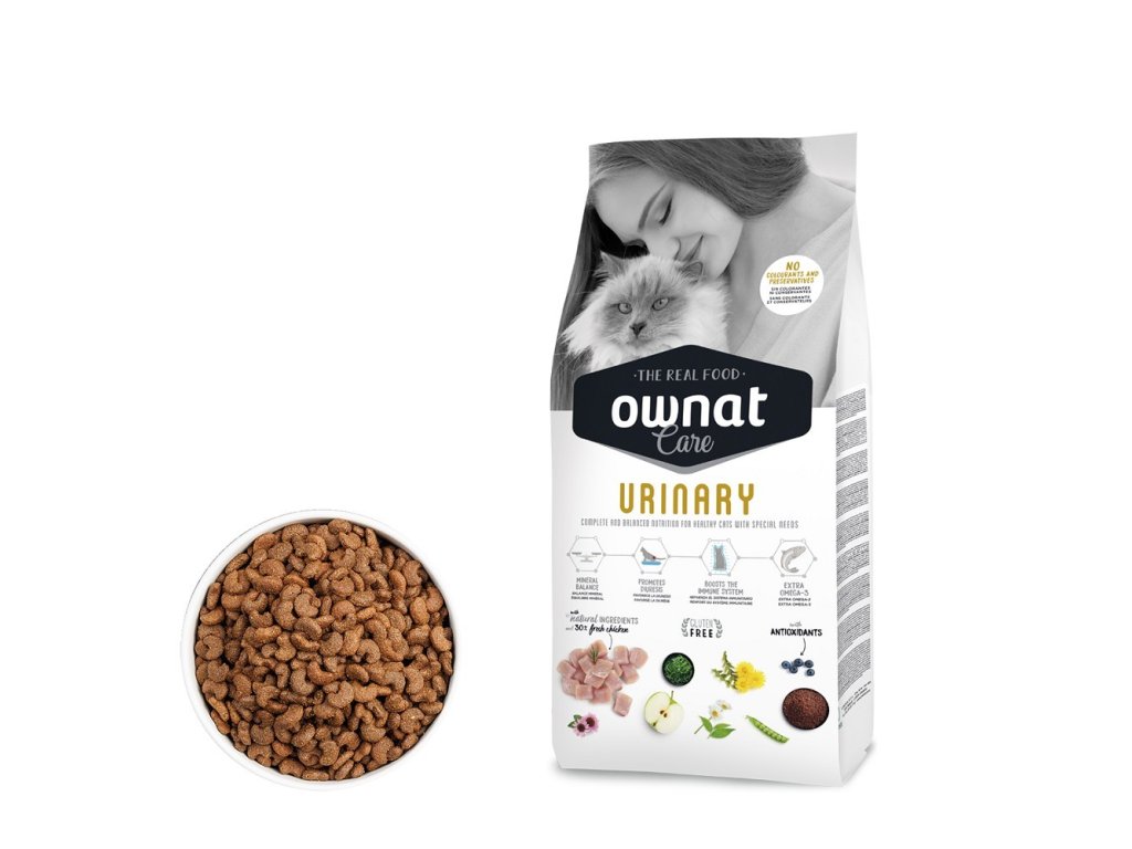 OWNAT CARE URINARY je ideální výživou pro dospělé kočky všech plemen citlivých na problémy s močovými cestami. Jeho složení obsahuje léčivé rostliny (pampelišku), které podporují diurézu, a spolu s brusinkami a řízeným obsahem minerálních látek přispívá k udržení optimálního stavu močových cest kočky.