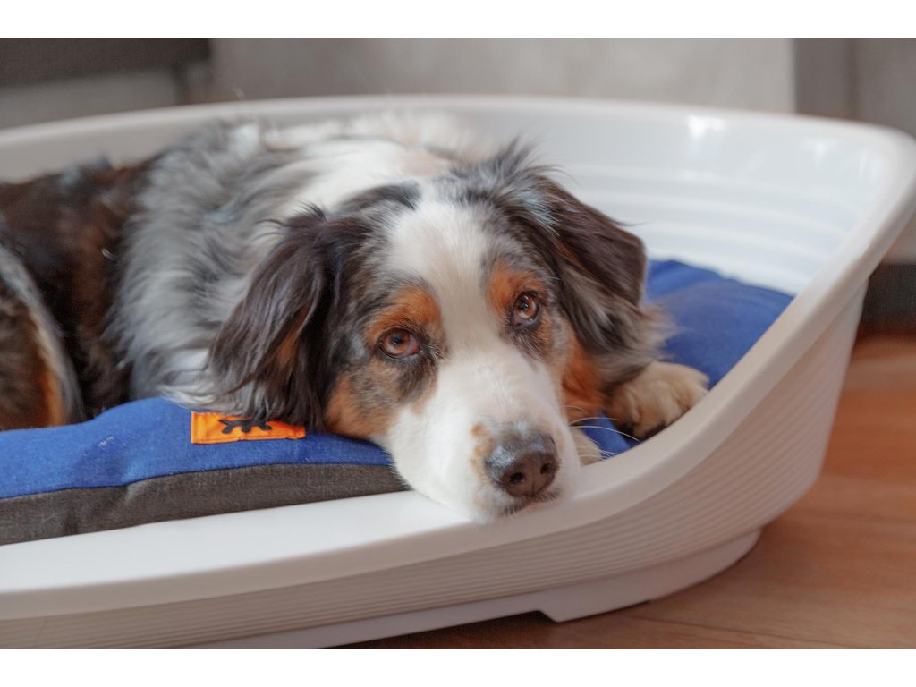 Kvalitní, plastový pelíšek s vyvýšenými okraji, sníženým vstupem a protiskluzovým podstavcem pro jedinečné pohodlí Vašeho pejska