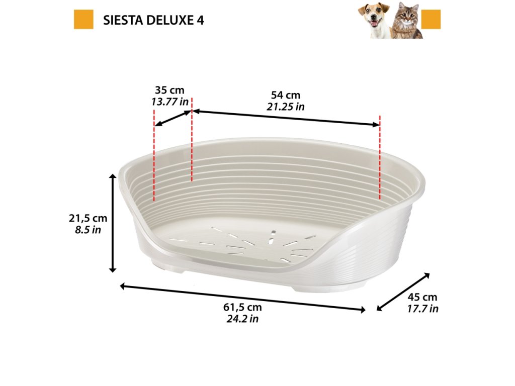 Plastové pelíšky Siesta Deluxe jsou dostupné v šesti velikostech, pro psy všech velikostí. Siesta Deluxe 2, 4, 6 a 8 jsou zvláště vhodné také pro kočky. Udělejte si čas a rozhodněte se, jakou barvu z naší široké nabídky preferujete.