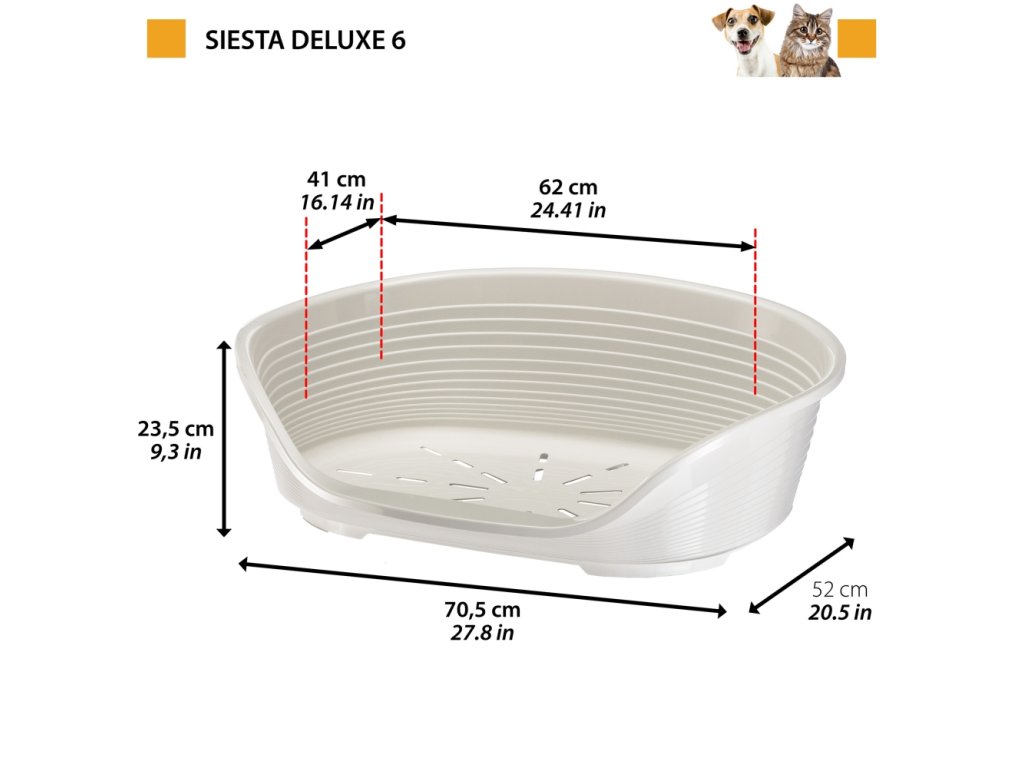 Plastové pelíšky Siesta Deluxe jsou dostupné v šesti velikostech, pro psy všech velikostí. Siesta Deluxe 2, 4, 6 a 8 jsou zvláště vhodné také pro kočky. Udělejte si čas a rozhodněte se, jakou barvu z naší široké nabídky preferujete.