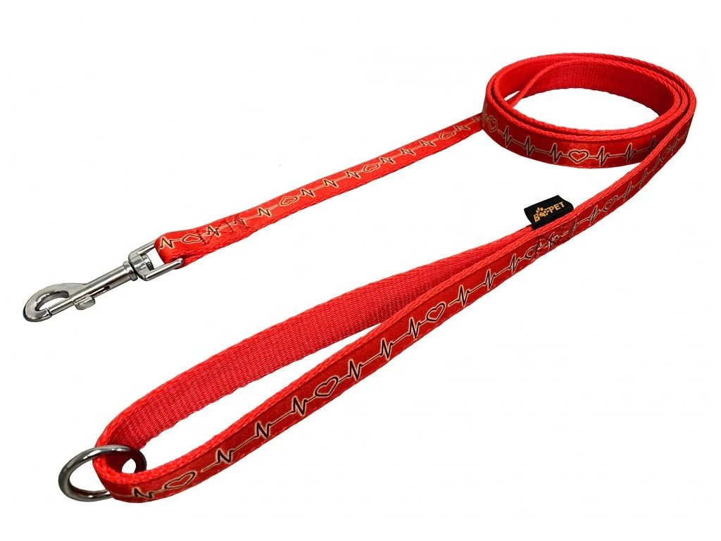 Vodítko je vyrobeno z měkkého popruhu s motivem EKG. Vodítko je pevně prošité, v uchu všitý svařovaný kroužek pro zkrácení na polovinu a přehození pes tělo.