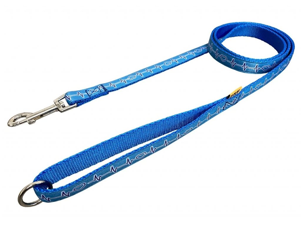 Vodítko je vyrobeno z měkkého popruhu s motivem EKG. Vodítko je pevně prošité, v uchu všitý svařovaný kroužek pro zkrácení na polovinu a přehození pes tělo.
