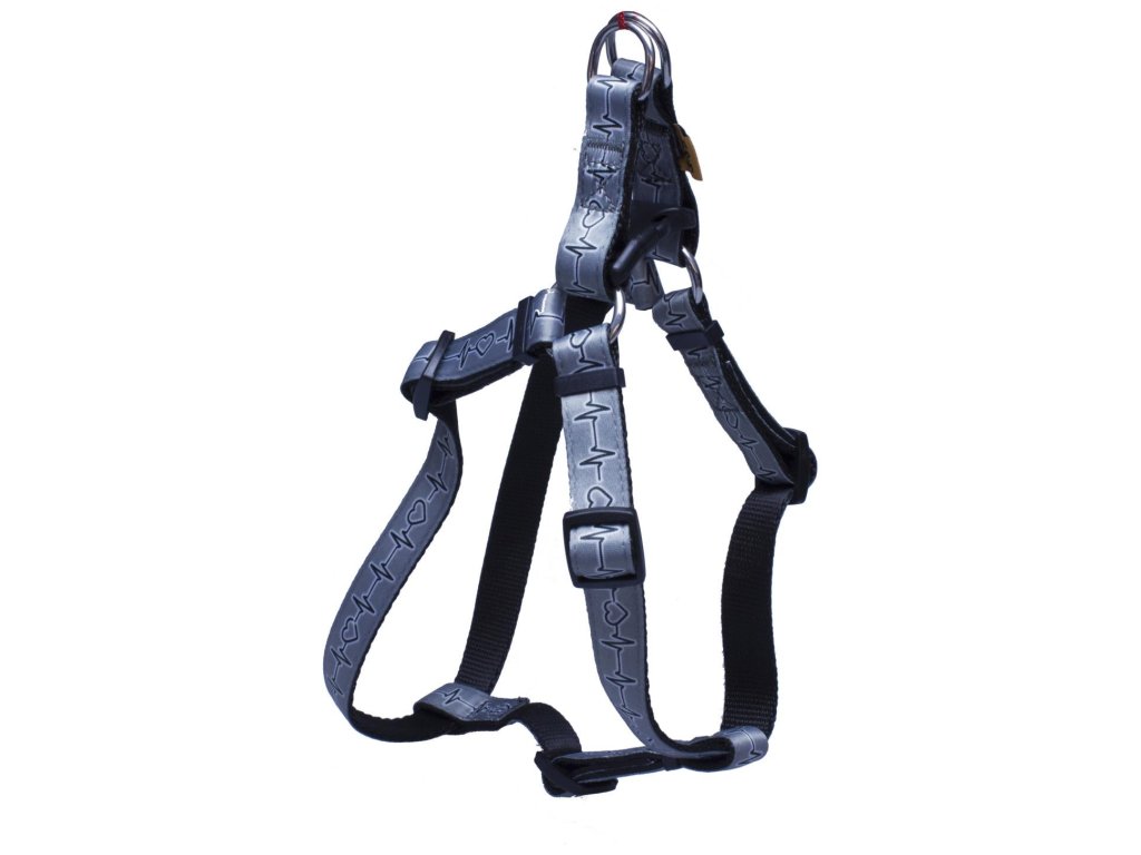 Postroj z popruhu s motivem EKG je velmi měkký a příjemný. Postroje jsou pevně prošité, na všech částech je možnost nastavení pro obvod krku, hrudního koše a hrudníku.