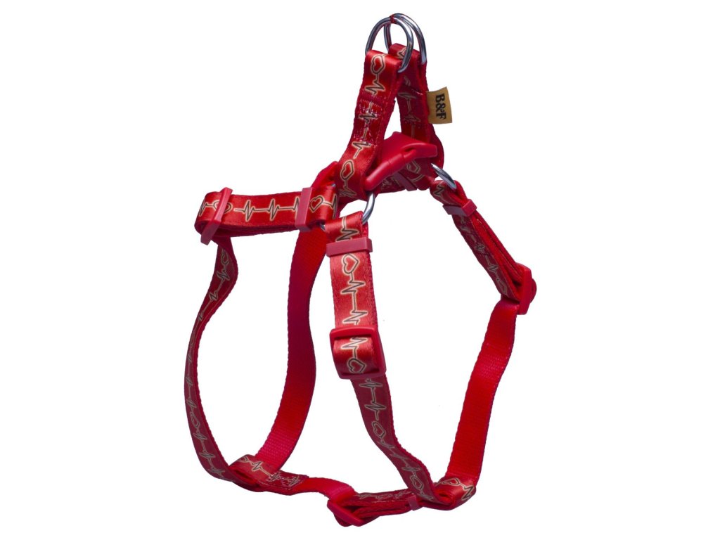 Postroj z popruhu s motivem EKG je velmi měkký a příjemný. Postroje jsou pevně prošité, na všech částech je možnost nastavení pro obvod krku, hrudního koše a hrudníku.