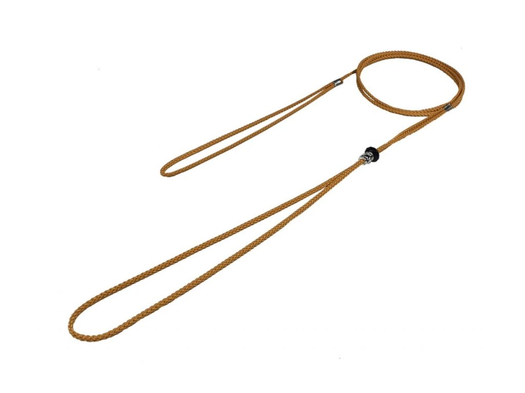 Nylonové vodítko na psy vhodné na výstavy a předváděcí akce. Vyrobeno z pevného a měkkého lanka. Spoje jsou spojeny plíšky. Na jednom konci je ucho a na druhém smyčka, kterou lze dle obvodu krku upravovat pomocí pojistného válečku.