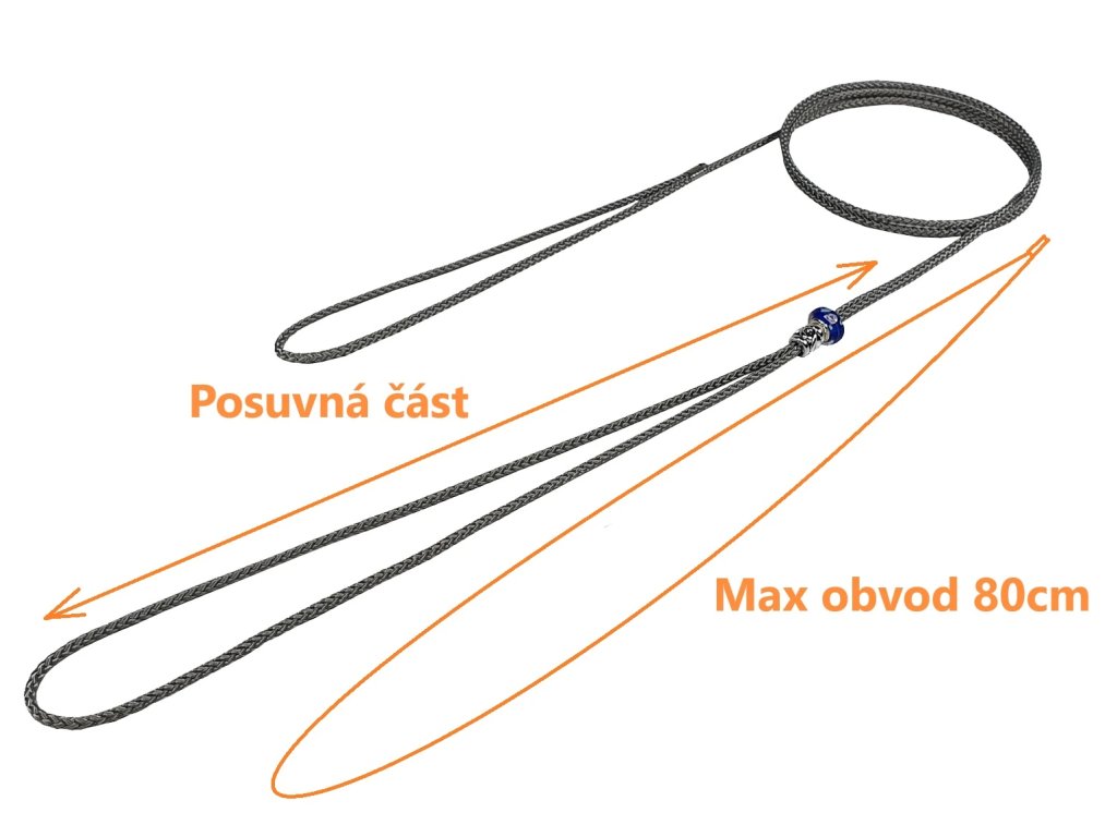 Nylonové vodítko na psy vhodné na výstavy a předváděcí akce. Vyrobeno z pevného a měkkého lanka. Spoje jsou spojeny plíšky. Na jednom konci je ucho a na druhém smyčka, kterou lze dle obvodu krku upravovat pomocí pojistného válečku.