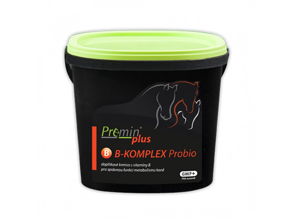 Doplňkové krmivo Premin® plus B-komplex Probio je určeno k doplnění hladiny vitamínů skupiny B v krmné dávce koní. Vitamíny skupiny B fungují především jako katalyzátory metabolismu proteinů, tuků a cukrů a hrají roli v utváření tkání z živin, které kůň přijme v krmivu. Potřeba vitamínů B roste při zvýšené fyzické zátěži, březosti a laktaci, při výskytu parazitů v organismu, při výskytu mykotoxinů v krmivu a při podávání antibiotik. Přídavek vitamínů B je vhodný také při průjmových onemocněních, kdy se celkově snižuje jejich biosyntéza a vstřebatelnost ve střevech. Stejně tak je vhodné doplňovat hladinu vitamínů B u starých koní se sníženou funkčností trávicího traktu.
