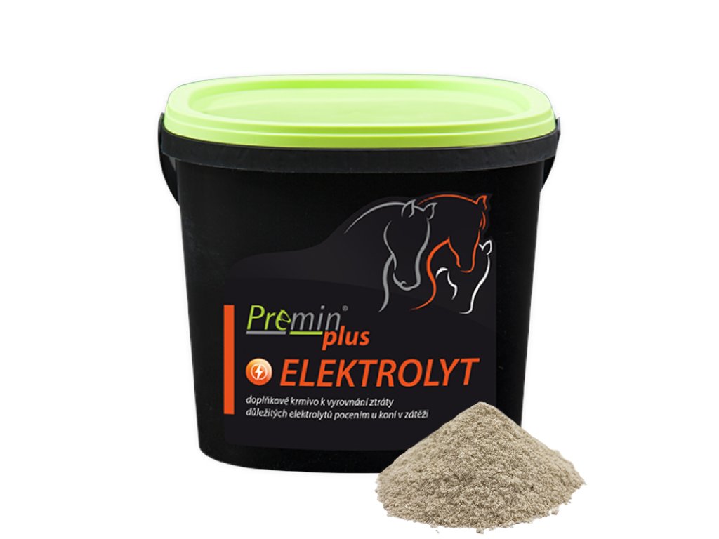 Premin® plus ELEKTROLYT je minerální krmivo určené k vyrovnání ztráty důležitých elektrolytů pocením u koní v zátěži. Vitamin C a E slouží jako antioxidanty. Glukóza a syrovátka jsou zdrojem pohotové energie pro výkon koně.