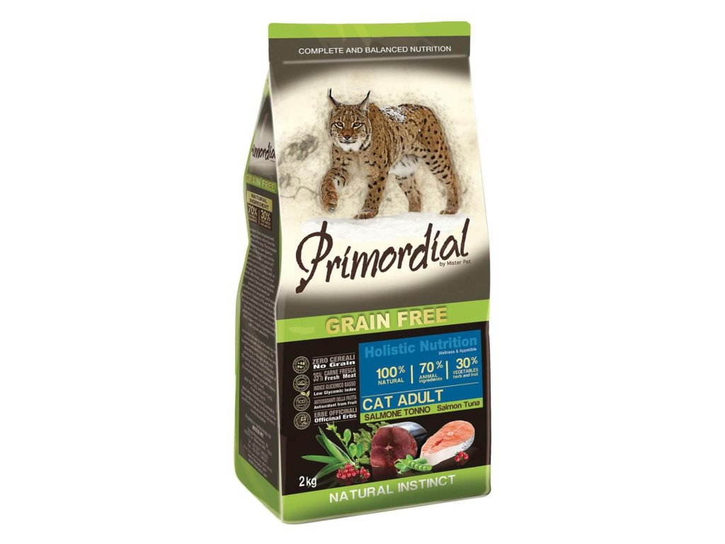 Primordial losos a tuňák pro dospělé je kompletní vysoce stravitelné bezobilné krmivo bohaté na bílkoviny vysoké biologické hodnoty a vhodnou kompozici aminokyselin. Losos a tuňák, striktně z lovené produkce, nabízejí kompletně a jednoduše stravitelné bílkoviny a atraktivní chuť, kterou kočky milují. Jsou též zdrojem omega 3 mastných kyselin, které vykonávají důležitou kosmetickou funkci pro kůži a srst a jsou velmi prospěšné pro kardiovaskulární systém (srdce a cévy). Ovoce a zelenina bohaté na vitaminy, minerály a fytonutrienty, lespedézie s blahodárnými účinky na močové cesty a brusinky s antioxidační funkcí dodávají tomuto krmivu dokonalou rovnováhu chuti a živin. Jedná se o skutečně holistický produkt, který aktivně přispívá k celkovému zdraví kočky.