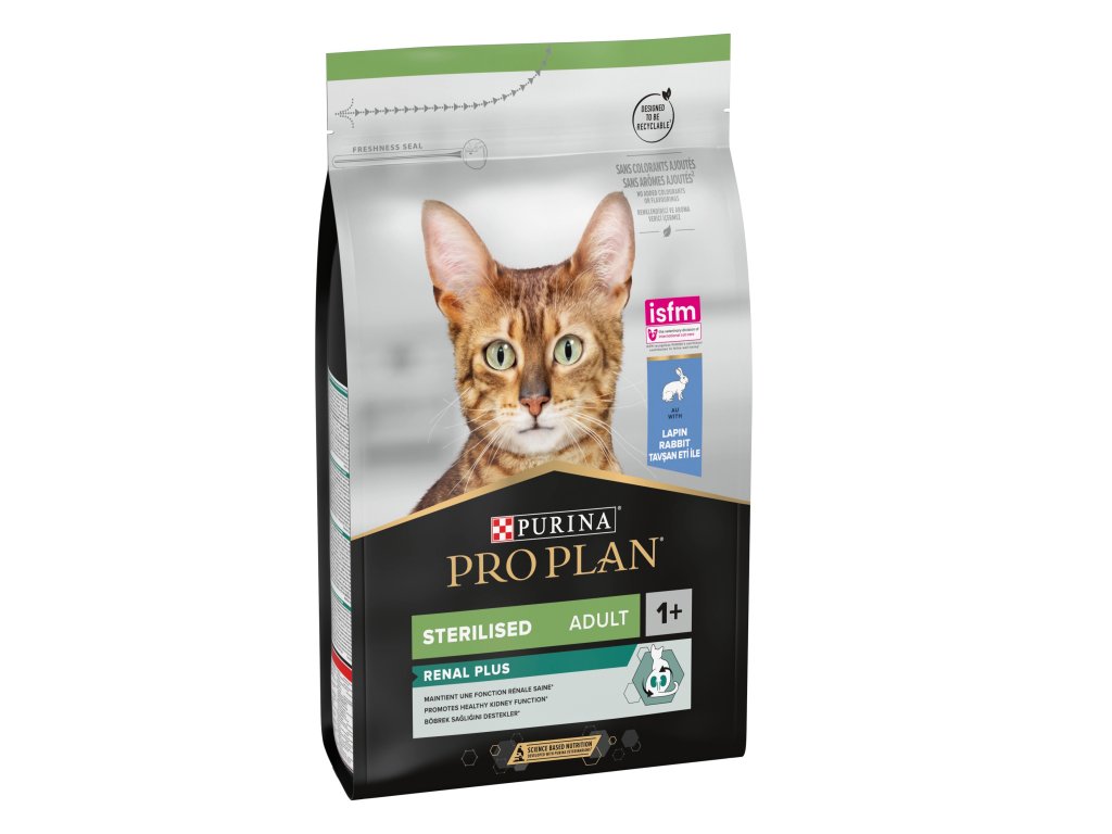 Kompletní, vyvážené krmivo ProPlan Cat Sterilised pro mladé a dospělé kastrované či sterilizované kočky s králičím masem, se sníženým podílem energie. Vysoce stravitelná receptura ProPlan Sterilised je speciálně sestavena tak, aby zabraňovala přibírání na váze a ochraňovala močové cesty. Vysoký podíl bílkovin a vlákniny pomáhá snižovat riziko nadměrného ukládání tuků. Díky tvaru a struktuře granulí pomáhá předcházet tvorbě zubního plaku a kamene.