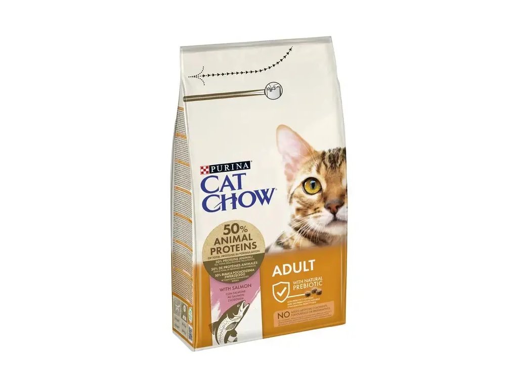 Kompletní, vyvážené krmivo Purina Cat Chow Adult pro dospělé kočky od 1 roku života, s obsahem kvaliního lososího masa a masa z tuňáka.