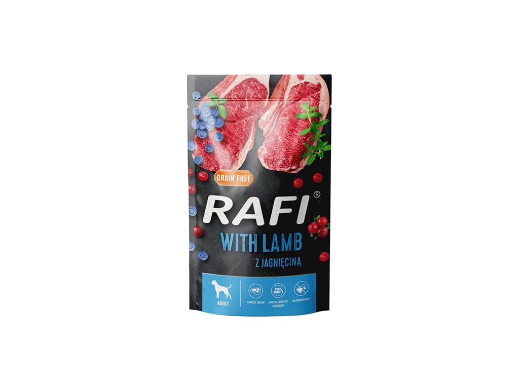 Krmivo, které pokryje 100% denní potřeby všech živin, minerálů a vitamínů pro vašeho pejska. Jehněčí maso je zdrojem zdravých bílkovin, vitamínů skupiny B a mnoha cenných mikro- a makroelementů, které podmiňují správné fungování dospělého psa. Mastné kyseliny omega-3 a omega-6 podporují přirozenou imunitu a také se podílejí na regulaci metabolických procesů. Mokré krmivo Rafi obsahuje správné poměry selenu a mědi. Přidání tymiánu zvyšuje senzorickou přitažlivost tohoto mokrého jídla. Jehněčí maso a suroviny jsou také zdrojem aminokyselin methioninu, isoleucinu a cystinu. Kvalitu krmiva zvyšuje obsah borůvek a brusinek, které jsou zdrojem mnoha cenných vitamínů a živin.