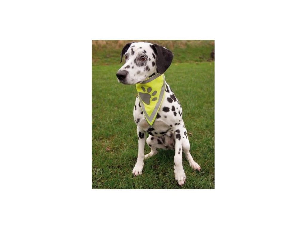 Bezpečnostní šátek je vyroben z neonově žlutého polyesteru, je ozdoben reflexními pruhy a tlapkou. Tím je zaručena perfektní viditelnost psa ve dne i v noci. Užijte si svobodné procházky - i za tmy bude Váš čtyřnohý přítel na dálku vidět.