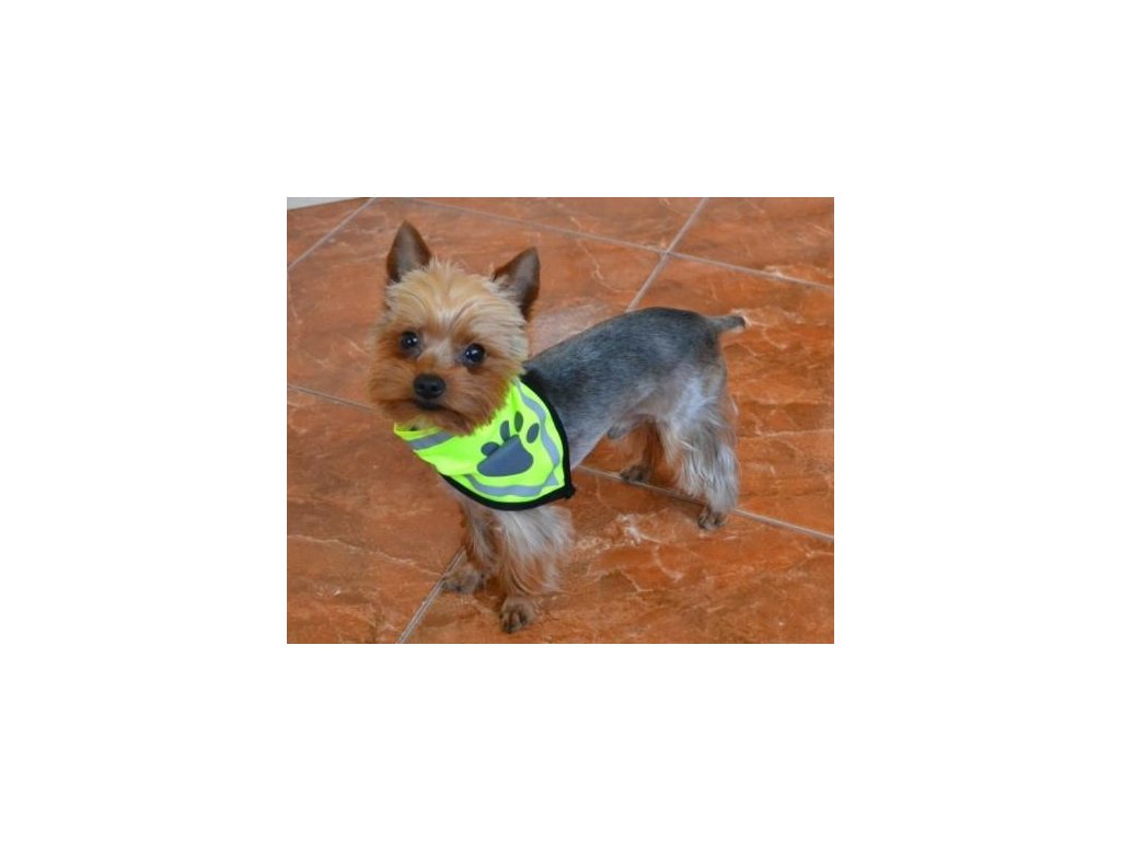 Bezpečnostní šátek je vyroben z neonově žlutého polyesteru, je ozdoben reflexními pruhy a tlapkou. Tím je zaručena perfektní viditelnost psa ve dne i v noci. Užijte si svobodné procházky - i za tmy bude Váš čtyřnohý přítel na dálku vidět.