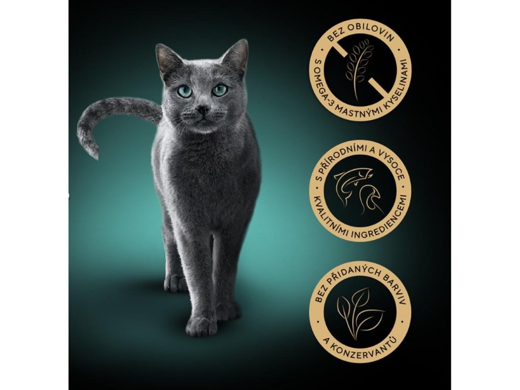 - Krmivo pro kočky s omega-3 mastnými kyselinami, vitamíny skupiny B a přírodními zdroji vitamínu E a B3.
