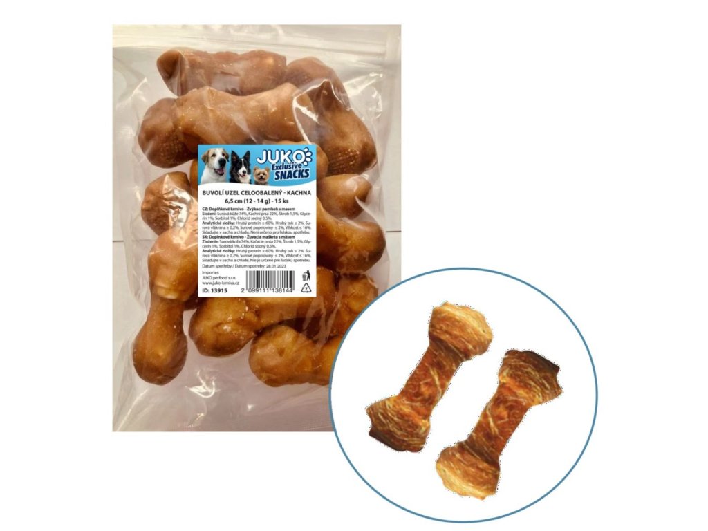 Složení: 74% surová kůže, 22% čerstvé kachní prsa, 1,5% škrob, 1% glycerin, 1% sorbitol, chlorid sodný 0,5%