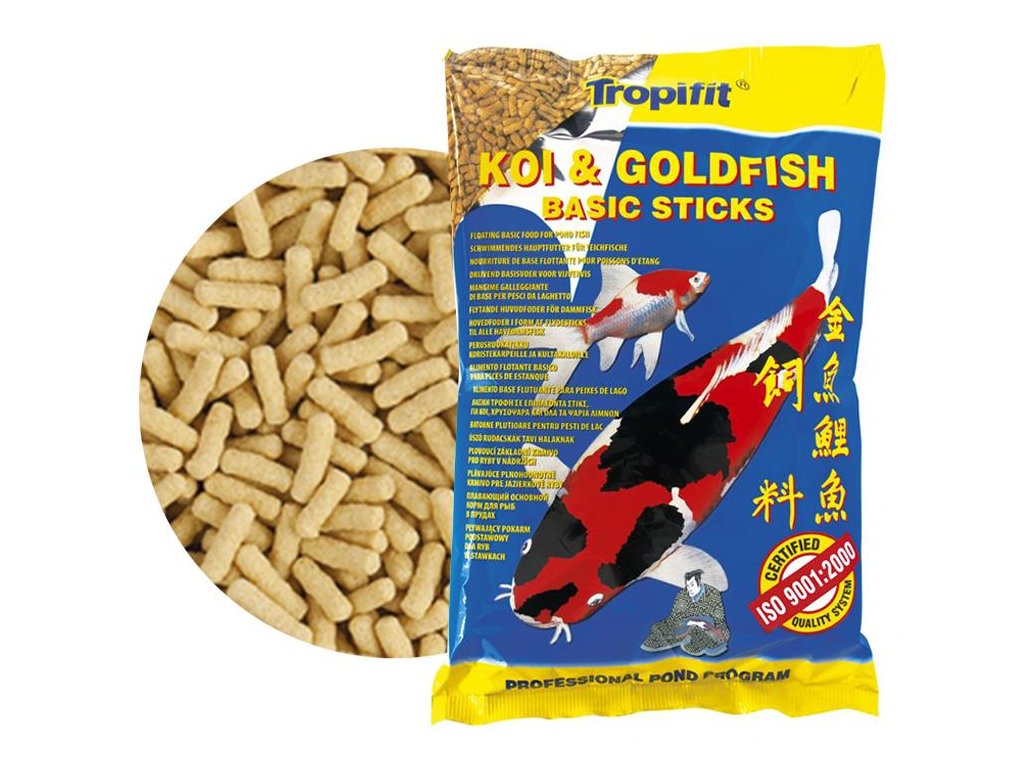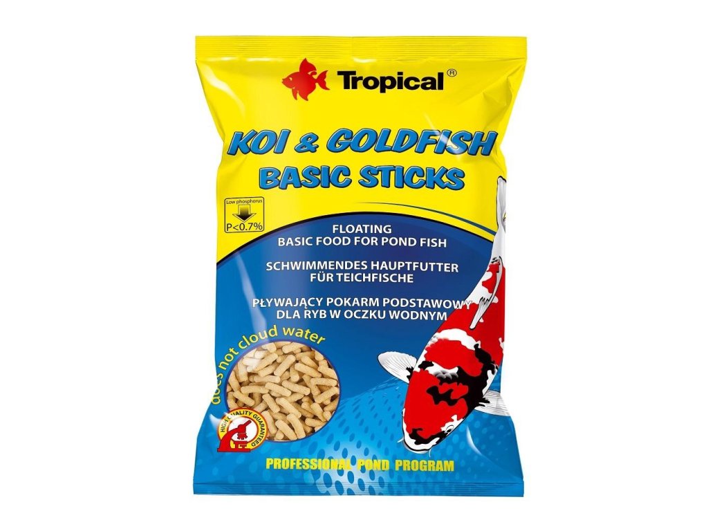 Kompletní krmivo ve formě plovoucích tyčinek pro barevné kapry koi, zlaté rybky a všechny další okrasné kaprovité ryb chované v zahradních jezírkách a nádržích
