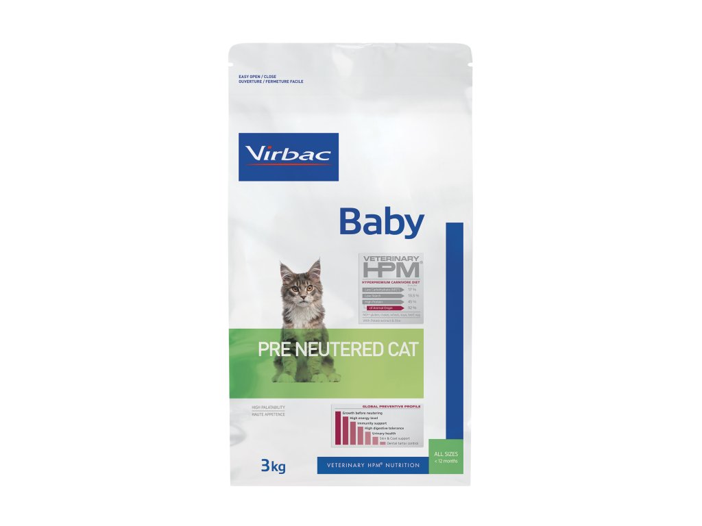 Receptura granulí Virbac Veterinary HPM Baby Pre-Neutered byla speciálně vyvinuta pro koťata od odstavu do 12 měsíců věku nebo před sterilizací. Mladé kočky potřebují ke správnému růstu hodně energie. Mají také nevyzrálý trávicí a imunitní systém, takže potřebují krmivo bohaté na funkční složky s řadou zdraví prospěšných látek. Virbac Veterinary HPM Cat Baby Pre-Neutered nejen podporuje zdravý růst a posiluje přirozenou obranyschopnost vašeho kotěte, ale také přispívá ke zdravé kůži a srsti a zároveň zlepšuje trávení a další tělesné funkce.