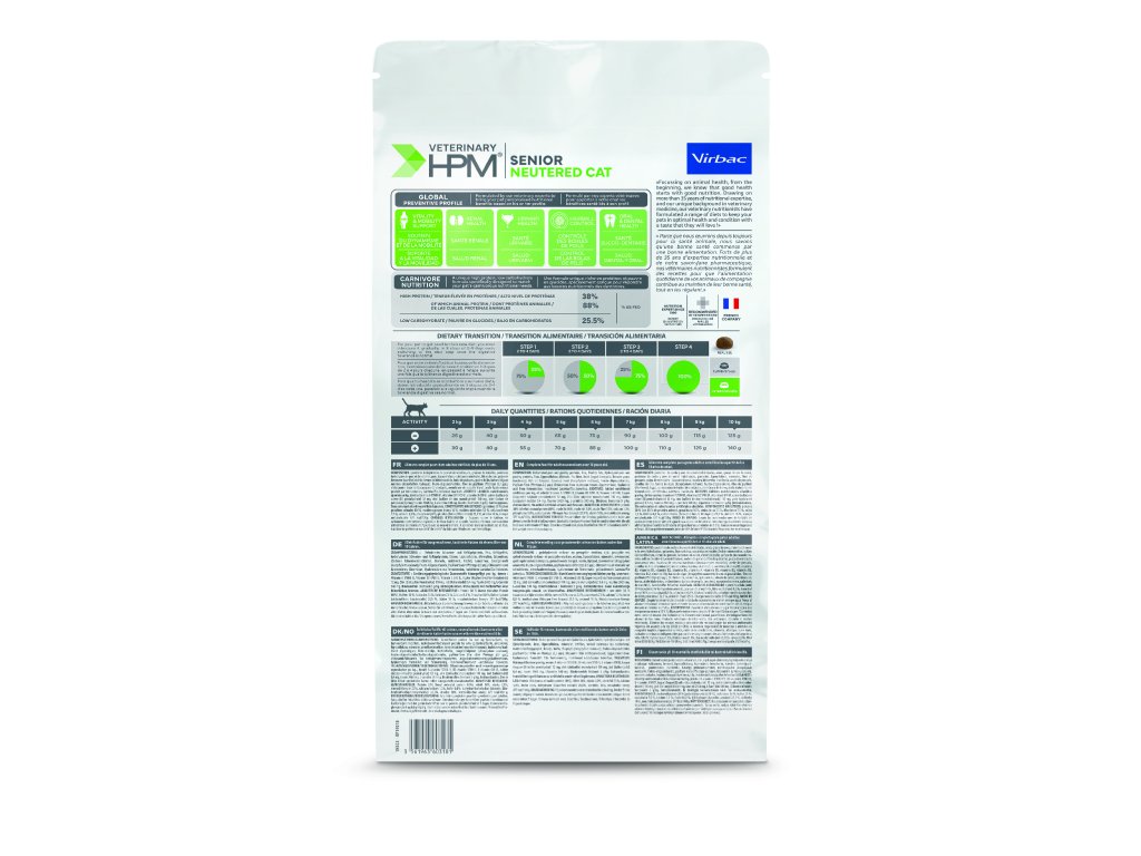 Virbac Veterinary HPM Senior Neutered bylo speciálně vyvinuto pro kastrované dospělé kočky starší 10 let. S přibývajícím věkem kočky často ztrácejí chuť k jídlu a ztrácejí hmotnost a svalovou hmotu. Mechanismus stárnutí buněk se stává výraznějším a tělesné funkce vyžadují zvýšenou pozornost. Receptura granulí Virbac Veterinary HPM Senior Neutered, bohatá na funkční složky, pomáhá snižovat rizika spojená se stárnutím a má pro vašeho mazlíčka řadu zdravotních výhod: nejenže pomáhá udržovat svalovou hmotu a zdraví ledvin a zubů, ale přispívá také ke zdraví kůže a srsti a zároveň zlepšuje trávení a další tělesné funkce.