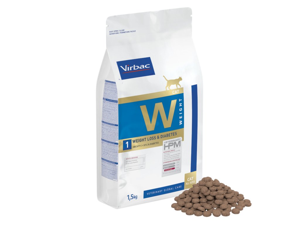 Toto dietní suché krmivo má nízký obsah energie a celkový obsah cukru. Díky tomu je krmivo Virbac Veterinary HPM Cat Weight Loss & Diabetes W1 vhodné i pro kočky trpící cukrovkou. Díky vysokému obsahu bílkovin a vlákniny je toto dietní krmivo příjemně syté a navíc podporuje udržování svalové hmoty. V neposlední řadě dodává toto dietní krmivo pro kočky cenné omega mastné kyseliny, které jsou nezbytné pro správnou funkci kůže.